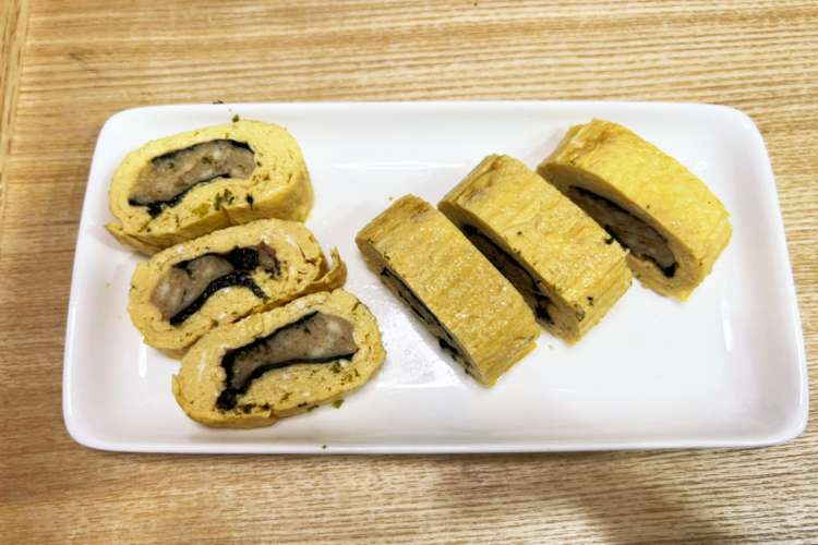 鰻巻-鰻巻き <材料>4人分 うなぎの白焼き 1/2尾 たまり醤油 100cc みりん 100cc ざらめ 80g 卵 6個 かつお昆布だし 100cc 塩 少々 大葉 3枚 サラダ油 適量 大根おろし 適量 <作り方> 1うなぎの白焼き八幡巻きを作ります。洗い牛蒡は、4つに裂きます。この後、米のとぎ汁でゆがき、八方だし(だし汁8、みりん1、濃口醤油1の割合)で調味します。 8 開いた鰻は頭部を切り落とします。 9 縦に2